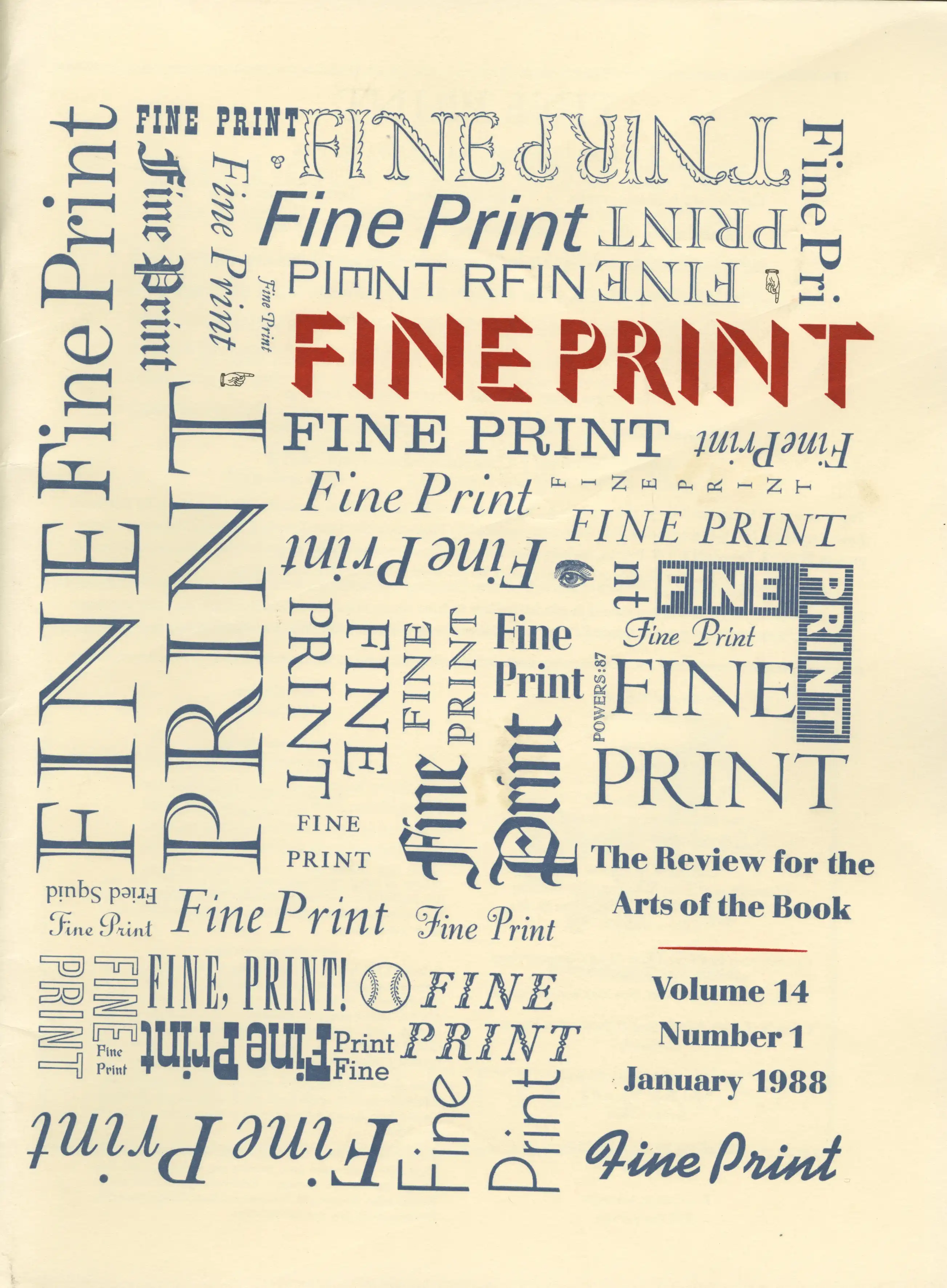 “Fine Print” (1975–1990), founded and edited by Sandra Kirshenbaum in San Francisco, was a quarterly devoted to the book arts—covering book printing, typography, binding, and calligraphy.