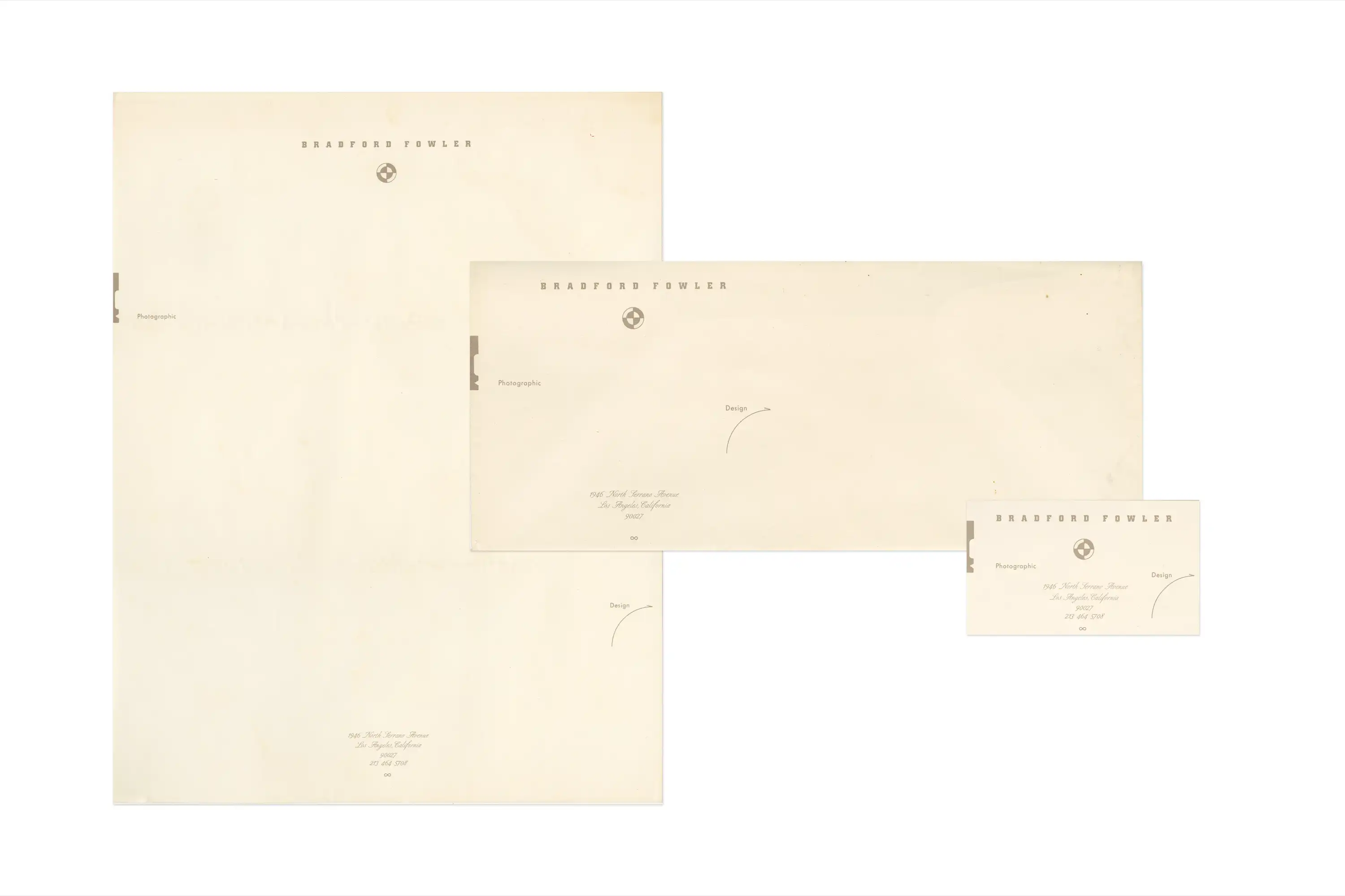 Operating from a residence in Los Feliz, Bradford Fowler maintained an independent photographic design practice centered on image composition, darkroom production, and other visual work. The visual identity features a lens-target emblem and an arrow, marking the movement from “photographic” to “design”.