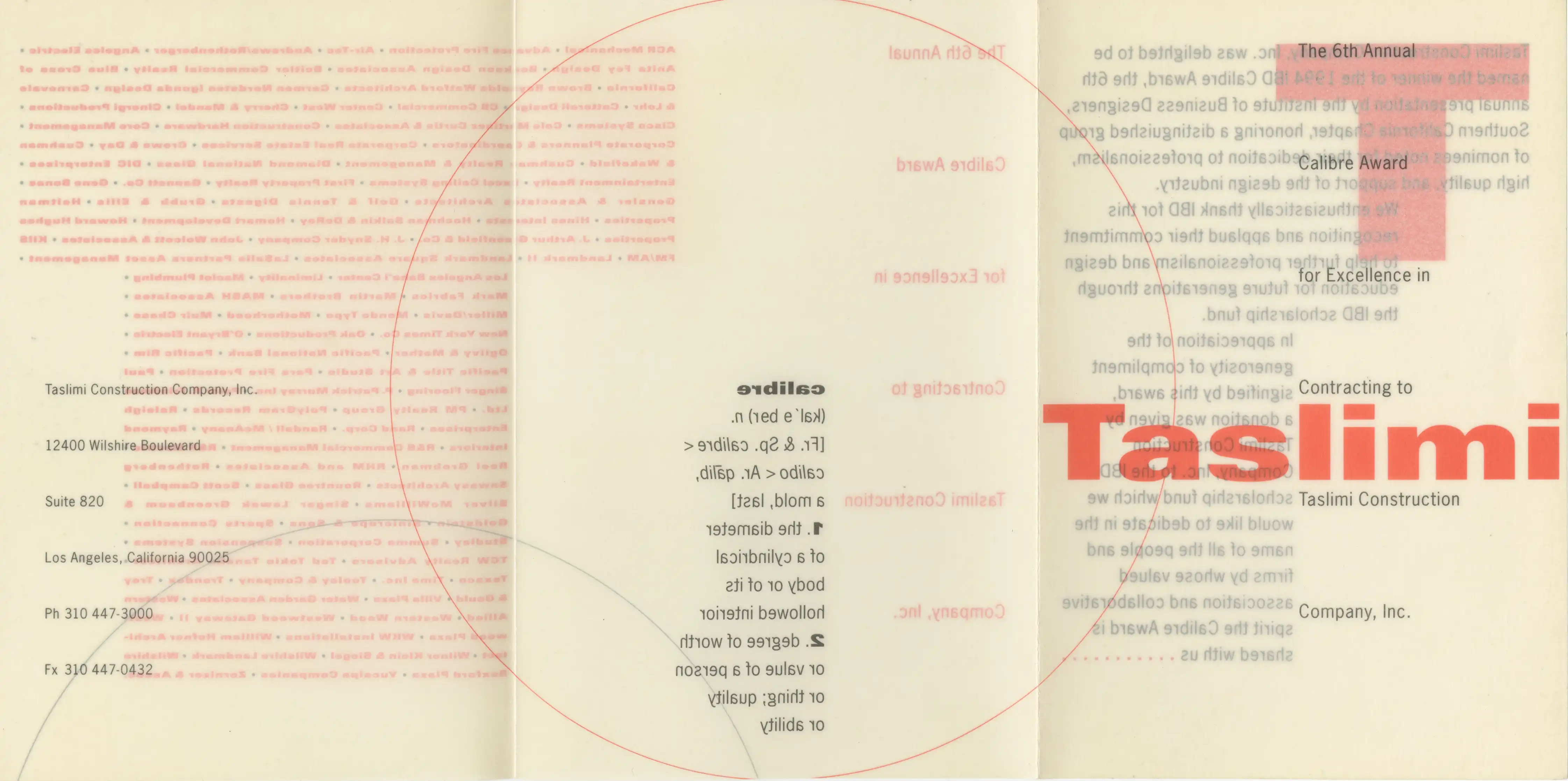 Based in Los Angeles, Taslimi Construction Company is a commercial construction and project management firm known for its work on corporate offices, cultural institutions, and public environments. This booklet is for the 6th Annual Calibre Awards held in West Los Angeles.