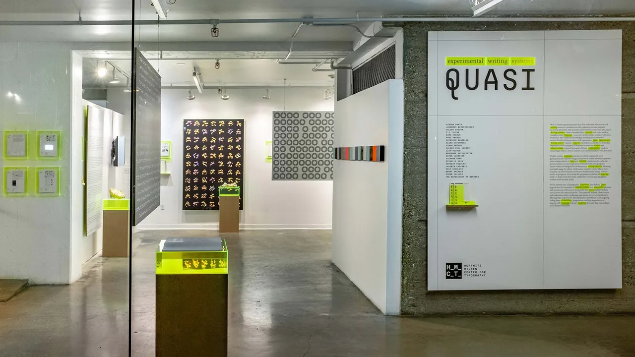 With a history spanning more than five millennia, the practice of writing serves as a testament to the enduring human impulse to record, preserve, and transmit information across time and space. Writing systems—sets of standardized symbols and rules used to convey language visually—can carry within them a culture’s history, traditions, and collective knowledge, making them powerful vessels of cultural preservation and expression. Quasi: Experimental Writing Systems explores the craft of inventing and designing writing systems that—unlike those that have evolved organically over generations of collective usage—were meticulously created at distinct points in time with intention and purpose. The projects in the exhibition present atypical configurations of signs and symbols inspired by science fiction, cryptography, modern technology, language preservation, sound, nature, and communication with the dead. Some works are designed to be functional writing systems, allowing potential usage by others, while some exist in a realm where functionality becomes entirely irrelevant. Furthermore, many remain works-in-progress, mirroring the perpetual evolution of language itself—a fluid entity that lacks a definitive version and adapts in tandem with societal shifts. At the intersection of typography, linguistics, and fiction, the exhibition approaches the invention of writing systems as a speculative process and an exercise to discover new quasi-realities within our systems of communication. This practice reveals a fascination with otherness where mythology and utopia are recurring themes. Through this exploration, Quasi contributes to an ongoing dialog about re-worlding, imagination, and the importance of playing with language to foster linguistic diversity that can reshape our collective narrative.
