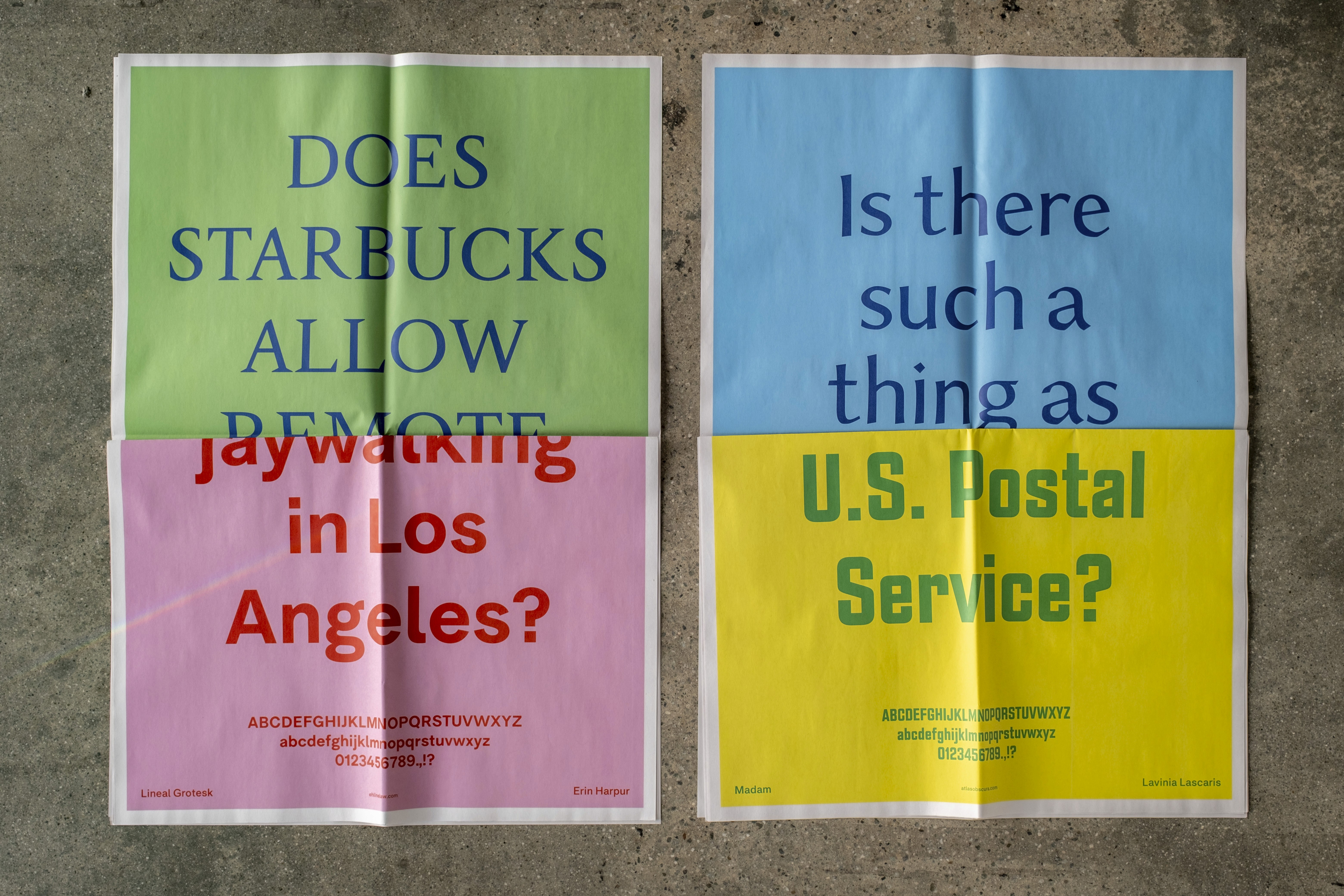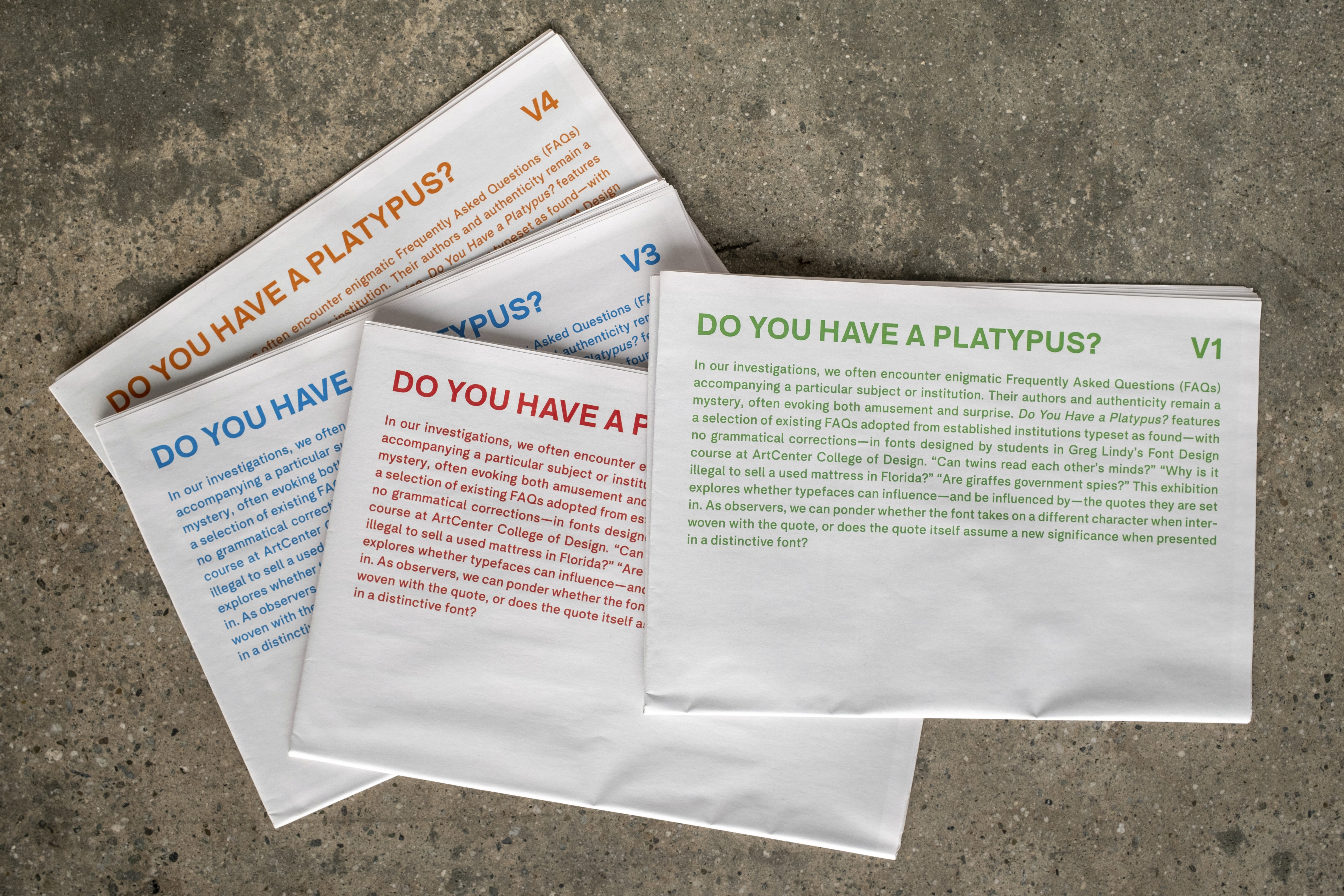 Published on the occasion of the exhibition Do you have a platypus?, presented at the HMCT Gallery in 2023, this four-volume series features a selection of existing FAQs adopted from established institutions typeset as found—with no grammatical corrections—in fonts designed by students in Greg Lindy’s Font Design course at ArtCenter College of Design. “Can twins read each other’s minds?” “Why is it illegal to sell a used mattress in Florida?” “Are giraffes government spies?”