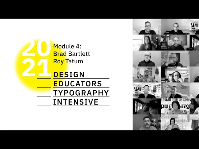 ![]() DETI: Module 4—Brad Bartlett & Roy Tatum: “Teaching Transmedia Typography” (Main Session) Brad Bartlett is a designer, educator, author, and founder of Brad Bartlett Design. His work has been recognized by the Art Directors Club, Type Directors Club, Communications Arts, Dezeen, AIGA 50 Books/50 Covers, Graphis, I.D., How, and Print. He is the Director of Transmedia at ArtCenter College of Design where he has developed transmedia pedagogy and overseen curricular implementation. Brad is also on-screen author at LinkedIn Learning, where he recently published a course on Transmedia Typography. Roy Tatum is a Los Angeles-based multidisciplinary designer whose work spans wearables, websites, apps, printed matter, and visual identities. Clients include Apple, Nike, The California Science Center, Wove, and Target. He is a Co-founder and Creative Director at Numbers, a design studio specializing in type design, identity design, and illustration projects both self-initiated and for a variety of clients. He teaches Generative Design and Generative Typography at ArtCenter College of Design. The first Design Educator Typography Intensive (DETI), a global virtual learning environment, was presented by HMCT on July 17–18, 2020. The two-day intensive provided educators, designers, and students access to some of the most talented typography instructors currently teaching, who generously shared their expertise during the four webinar sessions. This module explores typographic practice across traditional and emerging media in relation to the changing social and technological conditions of communication. | ![]() DETI: Module 4—Brad Bartlett & Roy Tatum: “Teaching Transmedia Typography” (Main Session) Brad Bartlett is a designer, educator, author, and founder of Brad Bartlett Design. His work has been recognized by the Art Directors Club, Type Directors Club, Communications Arts, Dezeen, AIGA 50 Books/50 Covers, Graphis, I.D., How, and Print. He is the Director of Transmedia at ArtCenter College of Design where he has developed transmedia pedagogy and overseen curricular implementation. Brad is also on-screen author at LinkedIn Learning, where he recently published a course on Transmedia Typography. Roy Tatum is a Los Angeles-based multidisciplinary designer whose work spans wearables, websites, apps, printed matter, and visual identities. Clients include Apple, Nike, The California Science Center, Wove, and Target. He is a Co-founder and Creative Director at Numbers, a design studio specializing in type design, identity design, and illustration projects both self-initiated and for a variety of clients. He teaches Generative Design and Generative Typography at ArtCenter College of Design. The first Design Educator Typography Intensive (DETI), a global virtual learning environment, was presented by HMCT on July 17–18, 2020. The two-day intensive provided educators, designers, and students access to some of the most talented typography instructors currently teaching, who generously shared their expertise during the four webinar sessions. This module explores typographic practice across traditional and emerging media in relation to the changing social and technological conditions of communication. |